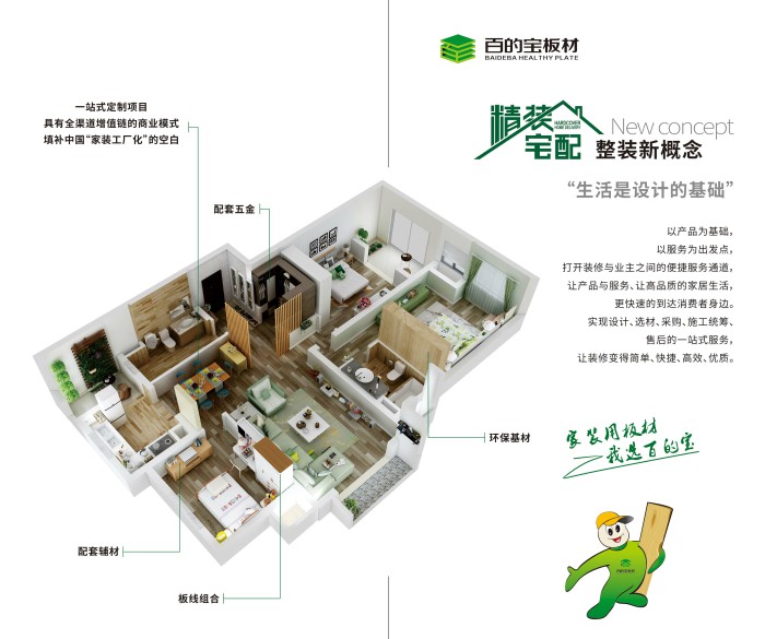 百的寶健康板材?精裝宅配以優(yōu)質(zhì)E0級(jí)板材、裝飾線條、精工配件等裝修材料為基礎(chǔ),延伸至裝修選材一站式服務(wù),不止是配套全裝修材料,還提供全裝及家居設(shè)計(jì)方案,同時(shí)對(duì)工藝進(jìn)行深化研發(fā),提供簡單易行高效高質(zhì)的家居裝配方案。