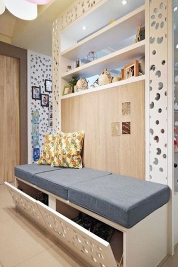 剛進(jìn)門就是客廳?這時(shí)候你就需要一個(gè)圖片上的玄關(guān),下面是鞋柜,上面做成收納各自,可以放些古玩和植物,既美觀又起到了格擋的作用,增加了客廳的空間感,私密感還不影響通風(fēng)透光。