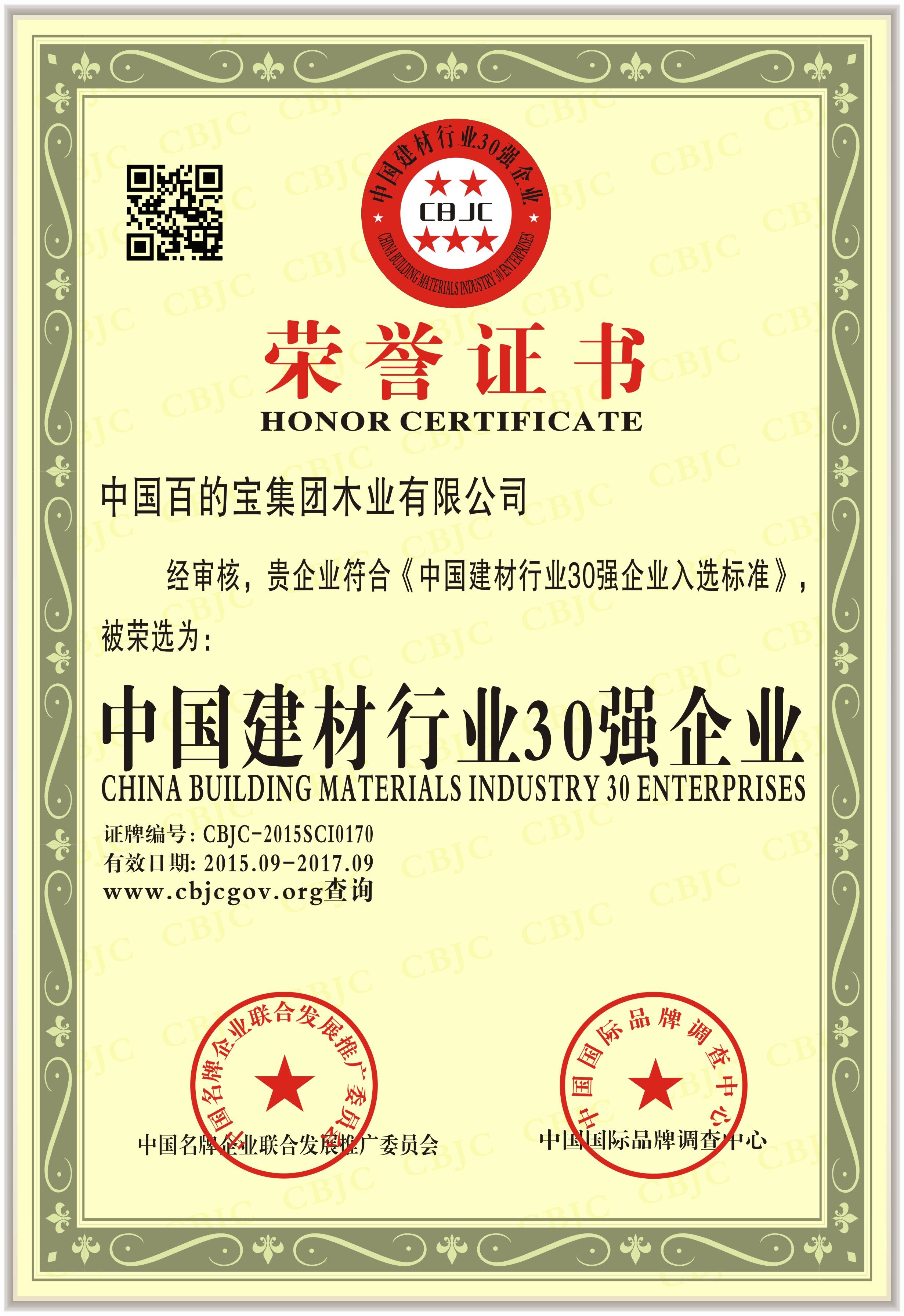 近日,中國(guó)百的寶集團(tuán)木業(yè)有限公司經(jīng)審核,公司符合《中國(guó)建材行業(yè)30強(qiáng)企業(yè)入選標(biāo)準(zhǔn)》,被中國(guó)名牌企業(yè)聯(lián)合發(fā)展委員會(huì)授予“中國(guó)建材行業(yè)30強(qiáng)企業(yè)”榮譽(yù)稱號(hào)。