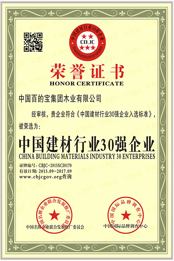 正是因為對質(zhì)量的高要求,嚴(yán)把關(guān),百的寶板材在每年市監(jiān)管局組織的質(zhì)量抽檢中次次合格。2015年9月中國名牌企業(yè)聯(lián)合發(fā)展推廣委員會、中國國際品牌調(diào)查中心檢測,授予中國百的寶集團(tuán)木業(yè)有限公司“中國建材行業(yè)30強企業(yè)”榮譽稱號。