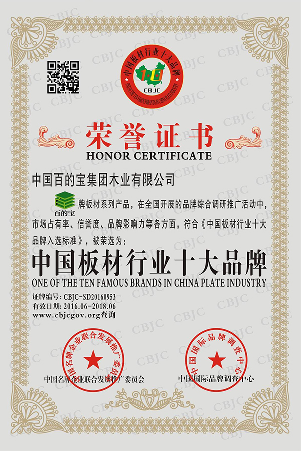 2016年06月中國名牌企業(yè)聯(lián)合發(fā)展推廣委員會、中國國際品牌調(diào)查中心檢測,授予中國百的寶集團(tuán)木業(yè)有限公司旗下“百的寶”品牌“中國板材行業(yè)品牌”榮譽(yù)稱號。
