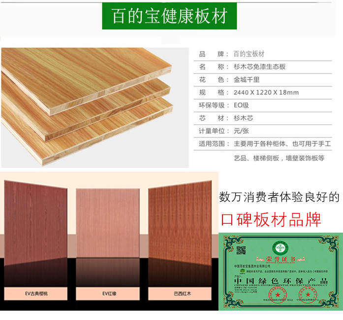1、中國百的寶集團(tuán)木業(yè)有限公司的E0生態(tài)板內(nèi)質(zhì)板芯——具有強(qiáng)防水、防腐、防蟲、防霉、防凍、抗老化的功能。更加環(huán)保耐用:在廚房、衛(wèi)生間、陽臺等環(huán)境比較惡劣的區(qū)域都能放心使用。
